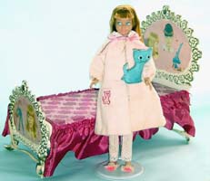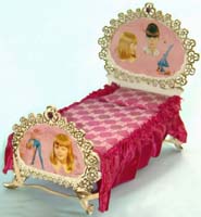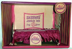 このスキッパーのベッドも、私が遊んだものなので当時日本で流通していたのは確かです。 ヘッドと足元に一つづつ紫のカットガラスがはめ込まれていて、スキッパーの宝石ベッドというわけです。 また、ヘッドと足元にアメリカの子供達の写真のシールが貼ってあります。 初代リカちゃんのベッドもヘッド部分にカットガラスがはめ込まれており、スキッパーのベッドの影響を感じます。 リカちゃんベッドも豪華さという意味では遜色ないでしょう。
