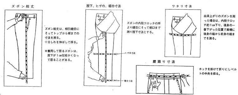 | 股上 | ズボン総丈−股下寸法です。 ご指定が無い場合には、当店サイズ表寸法になります。 |