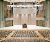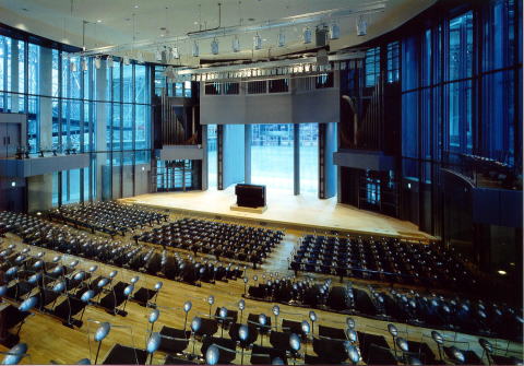 恐らく世界で初めてであろう、客席の周囲がガラス張りのパイプオルガンの為の音楽ホールを有し、2つの用途を共存させながら非常時に仕切る事が出来るように、建設大臣認定を受けて膜状の防火区画装置を設けている。また、上部構造から吊り下げられた喫茶スペースがホワイエの上い浮かんでいたり、アクリルで出来た音楽ホールの透明椅子等新しい試みに溢れた建築である。