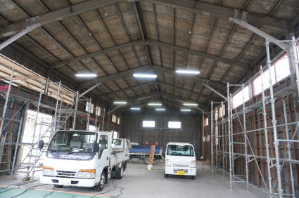 柱と梁を法杖により補強、壁と屋根に筋交いを追加、耐風梁も追加。 壁、間仕切り、天井下地は軽鉄にて下地組