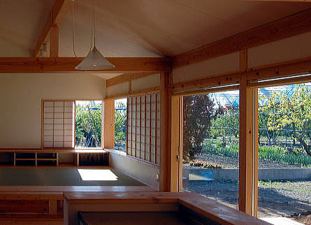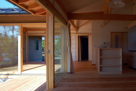 4つある庭の内『東の庭』に南面する食堂と畳の間それにオープンキッチン。板の間は『東の庭』と『西の庭』に間にあり、オープンキッチンにも面しています。
