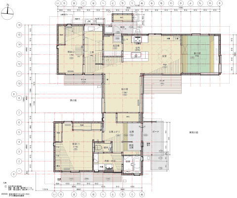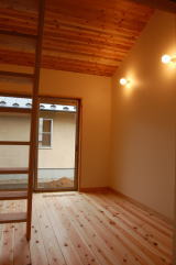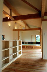 玄関、水回り(洗面・脱衣、浴室、トイレ)、寝室の棟が南面してあり、台所・食堂・畳の間・工房・個室の