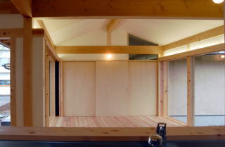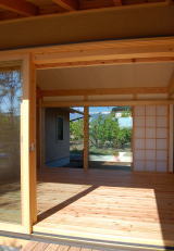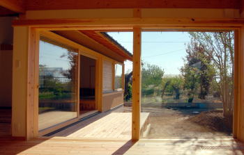 棟がその北側にあり、それらをつなぐ板の間が中ほどにあり、全体としてh型を横にしたような形になっている。食堂と板の間に面するウッドデッキテラスは午後は日陰となり日差しを遮り夏を旨としている。