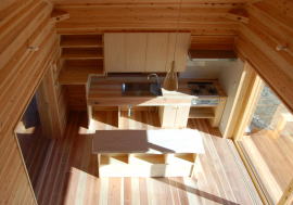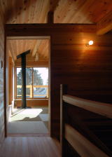 玄関は超コンパンクトで、室内床と同レベルで材質がタイルで靴脱ぎあるいは靴置き場という扱いです。階段の途中踊り場にトイレを配置して、洗面脱衣・浴室を含め4坪(8帖分)に納っています。でも狭く感じませんよ。階段を上ると2部屋をつなぐ廊下があり、そこの窓からはモミの木の幹が見えてきます。6帖の畳の寝室は居間食堂の吹抜けに面して広がりがあります。南面の窓はバルコニーがあり窓に腰掛けて展望台の様に見渡す事が出来ます。北側の予備室は隠れ家のような独立した感じの場所で、北窓からは八ヶ岳が東窓からはモミの木が見えます。この部屋の奥にはにじり口の様な小さな引き戸があり、開けて入ると1帖の板の間が階段吹き抜けに面してあります。小さいけれど変化に富んだこの空間は好奇心をくすぐり、都会の日常とは全く違う自然とのつながりにより、癒しや穏やかな心を取り戻せる場所となっています。