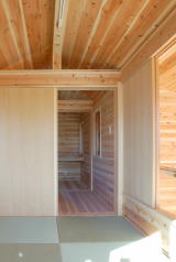 仕切るのとは別に、簡単時取り外しができるので外してみるとこれはまた今までと違う一体感のある、さらに広がりを感じる空間の誕生、新鮮な驚きと解放感が生まれる。四季の変化に応じて、暖かくなったら開放的に開き風を通して空気を感じる。寒くなってきたら閉じて入ってっくる日の光や薪の炎を楽しむ。大人が楽しめば子供も自然と感じて喜ぶ。小さな家で生まれる小さな喜びに幸福が宿ると思います。