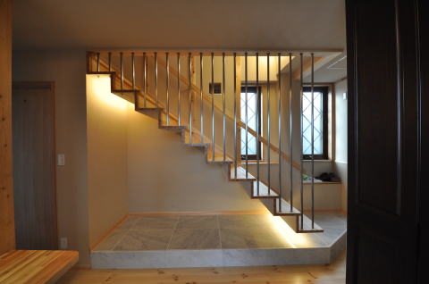 段数を増やしケ上げを低くし踏面を広くしました。玄関の正面に位置しますので広がり