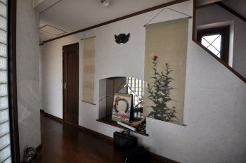 階段を壁で隠して段下にニッチを設けて飾り棚風にしていましたが