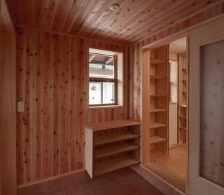 来客を確認できる小窓の付いた台所 食器及び食品庫 勝手口から見る 勝手口 正面外部出口、左手は洗面所