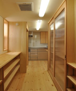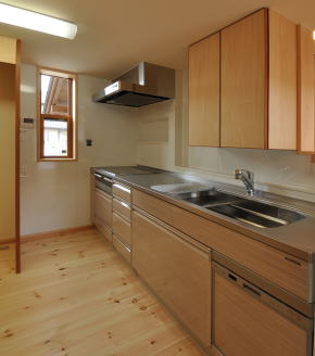 来客の確認ができる台所、菜園に直結する勝手口と作業スペース・・・台所は居間食堂に面して勝手口と食品庫を設けて、使いやすく明るい。