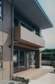 正面玄関。L型に折れ曲がった雁行した外観、光と風が上手く入ります。 深い軒が日陰を作り、落ち着いた雰囲気を作り出します。