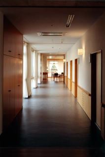 3つのグループ、各ユニットごとに3か所ある談話コーナー。ウッドデッキテラスに面している。 中庭を囲む廊下の曲がり角にある談話コーナー