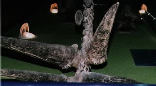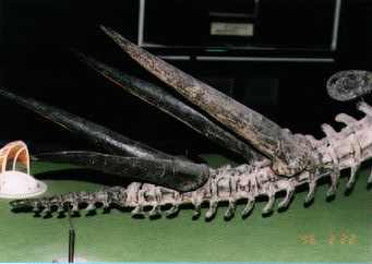 ステゴサウルスの全身骨格がありますがその尾のスパイクが尾の軸に対してどんな角度で付いているのか(付いているとして復元されているのか)見て下さい。