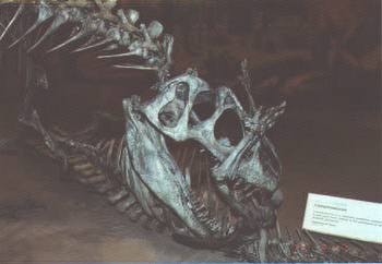 恐竜ホールの始めの部分には通路の右手に竜盤類の頭と骨盤を 次に鳥盤