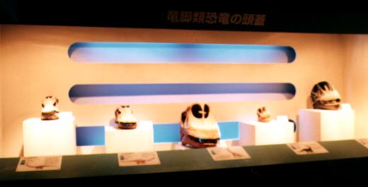 ずらりと並んだ竜脚類の頭蓋の模型。