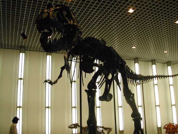 ![]() | 博物館は徳島市の市街地の南西でややへんぴな場所にある。文化の森公園という緑の多い静かな環境の中にある。美術館と共通の玄関を入る。博物館には縄文弥生文化の時代から中世に至る出土品の展示と蜂須賀藩政下の庶民の暮らしを中心とした展示と現代四国の鉱石と動植物の展示がある。入り口を入るとまずアンモナイトの展示があり次いで恐竜ホールがある。順路の終わりの方にラプラタ記念ホールという 明るい部屋がある。恐竜ホールとラプラタホール以外はストロボ使用禁止になっている。恐竜ホールの中央を占めるのはティラノサウルスの復元骨格である。 |